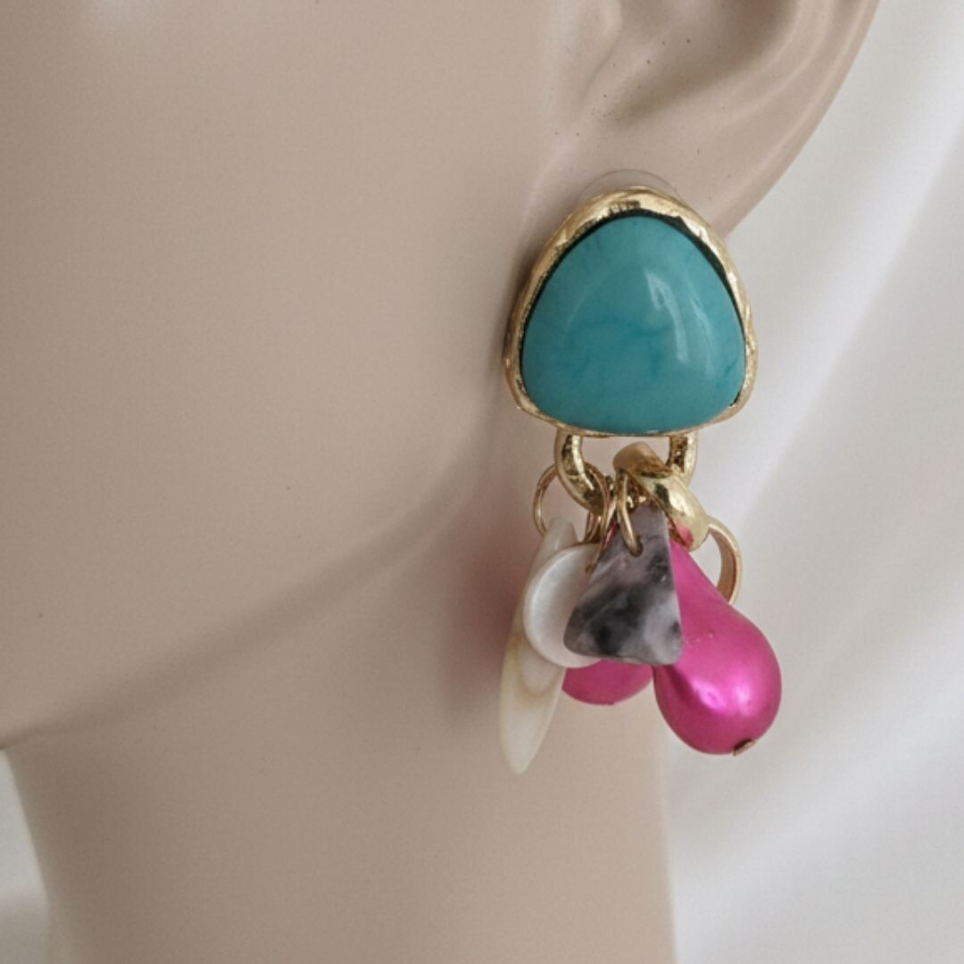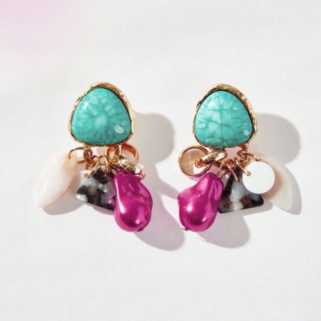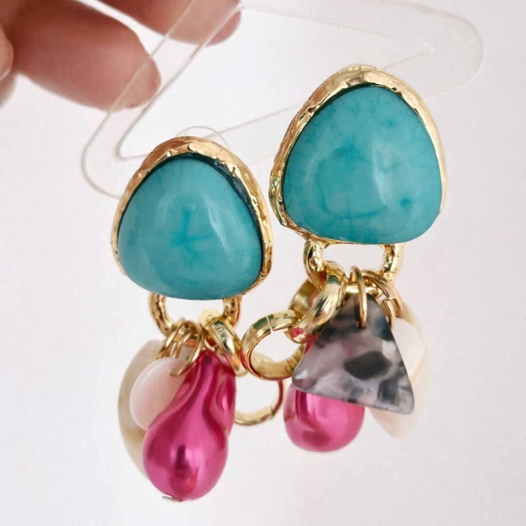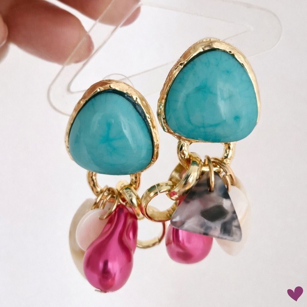 Um brinco marcante com base em pedra turquesa e detalhes dourados, finalizado com pendentes coloridos que trazem movimento e personalidade à peça. Vibrante, moderno e perfeito para quem ama acessórios que transformam o look.