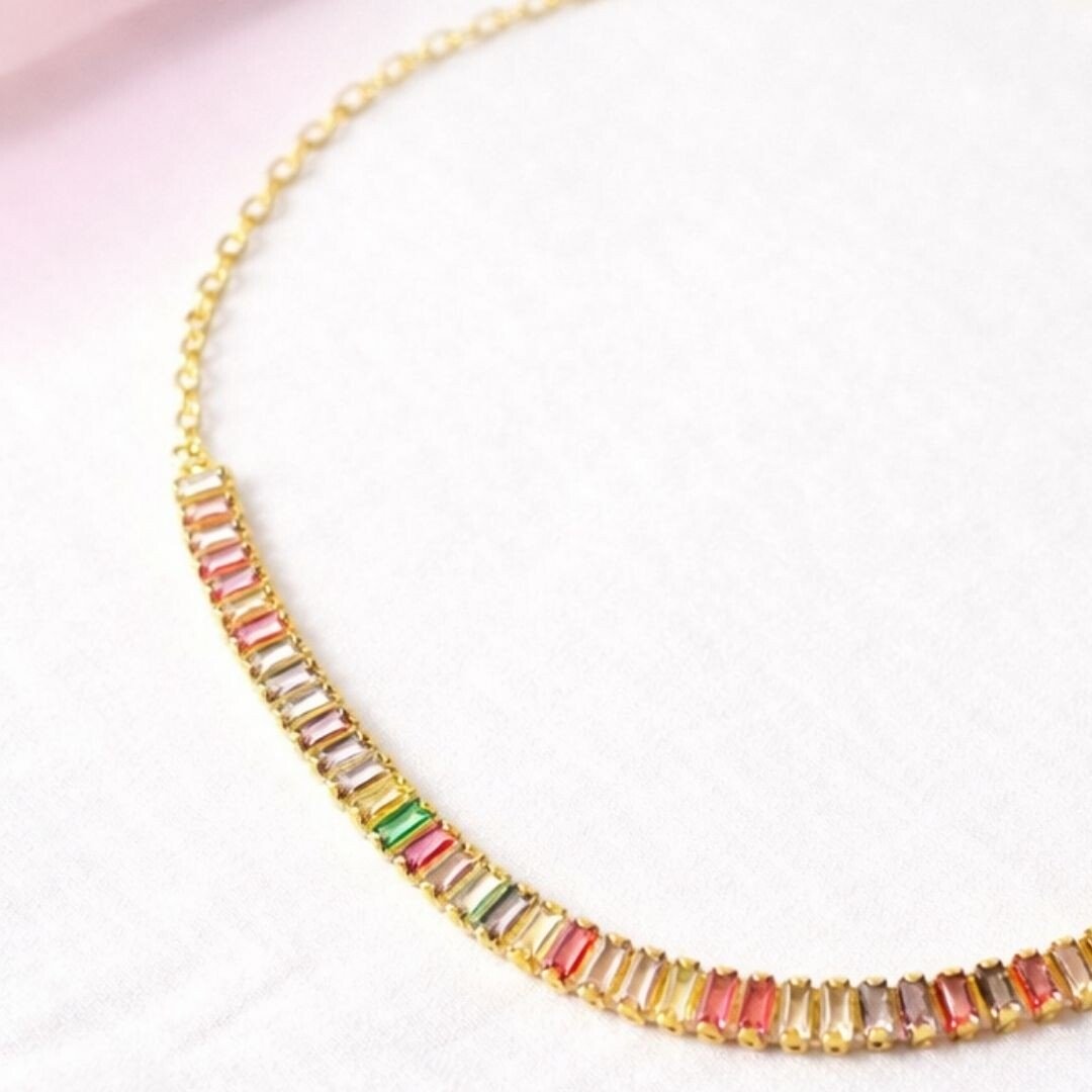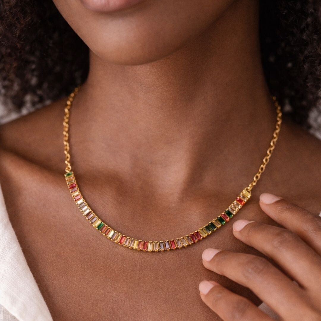 O Colar Cristais Coloridos Aurora traz uma sequência delicada de pedrinhas coloridas que refletem a luz de um jeito encantador. O resultado é uma peça bonita, alegre e cheia de personalidade.