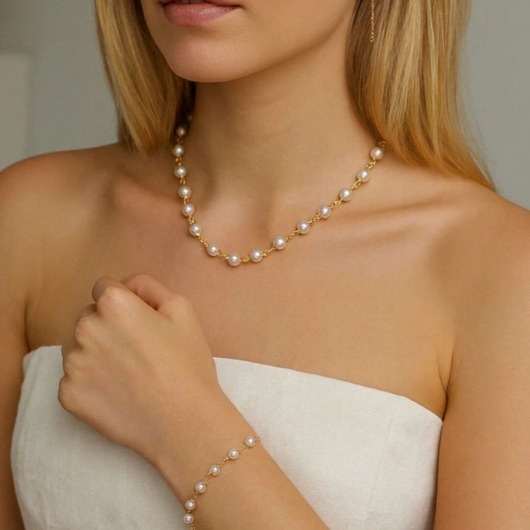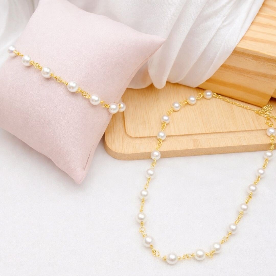 O colar e a pulseira possuem pequenas pérolas distribuídas ao longo da corrente, formando um design leve, sofisticado e muito fácil de combinar com diferentes estilos.